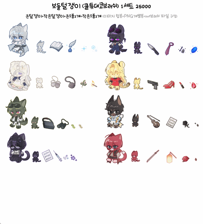 고정되어 있는 것은 큰털쟁이 / 작은털쟁이 기본 틀만, 귀꼬리는 캐릭터에게 맞춤형으로 매번 새로 그립니다!